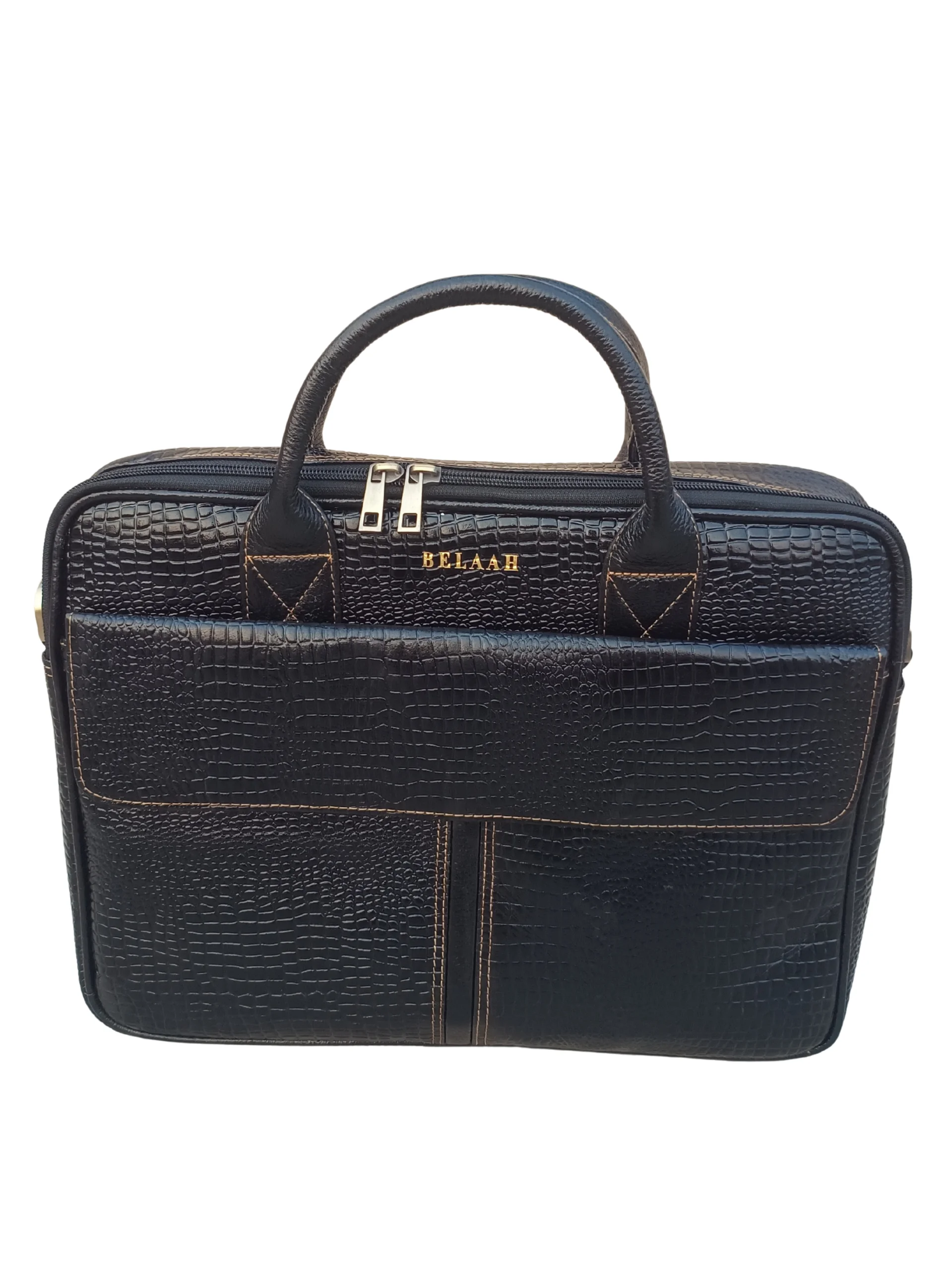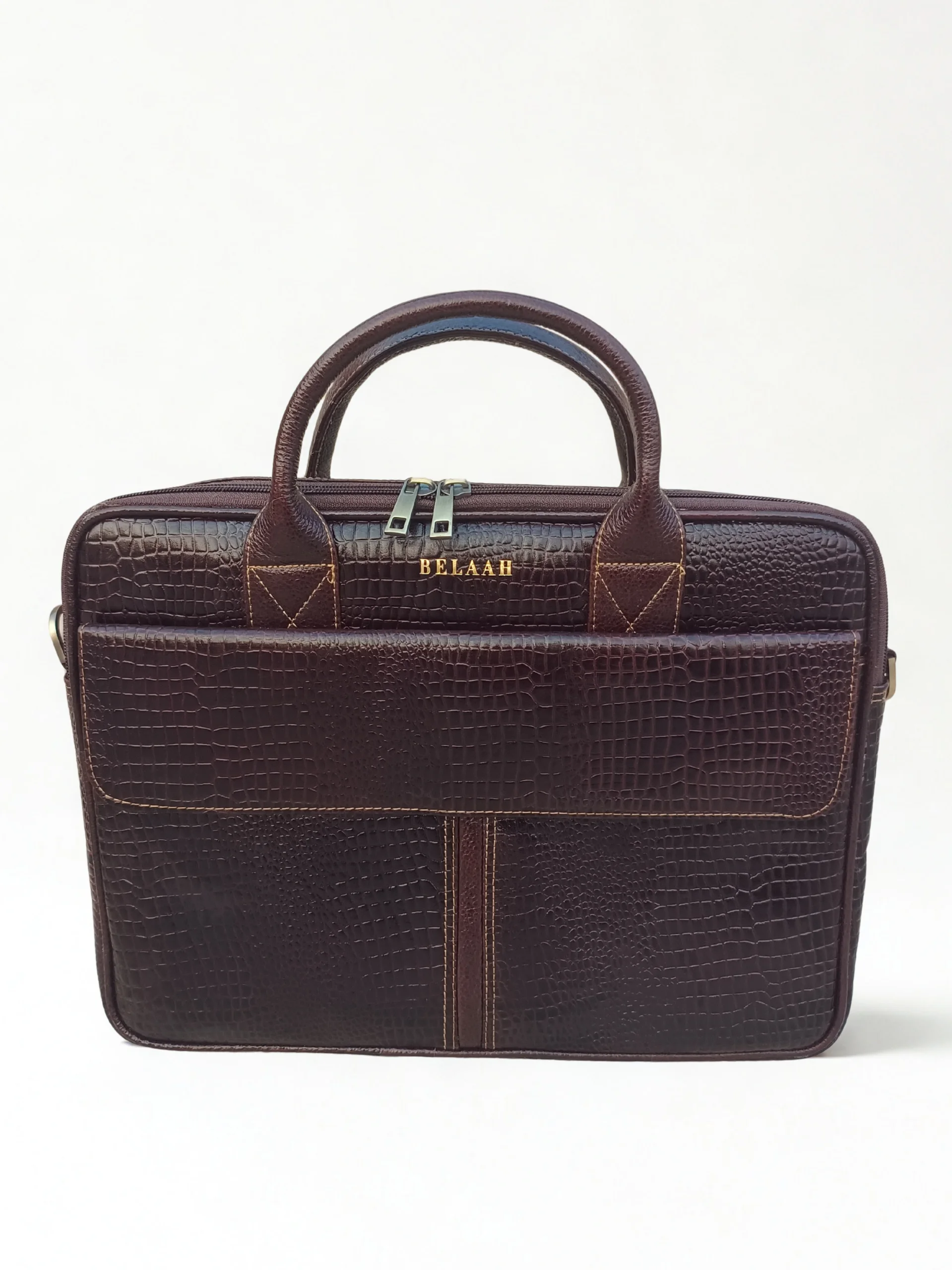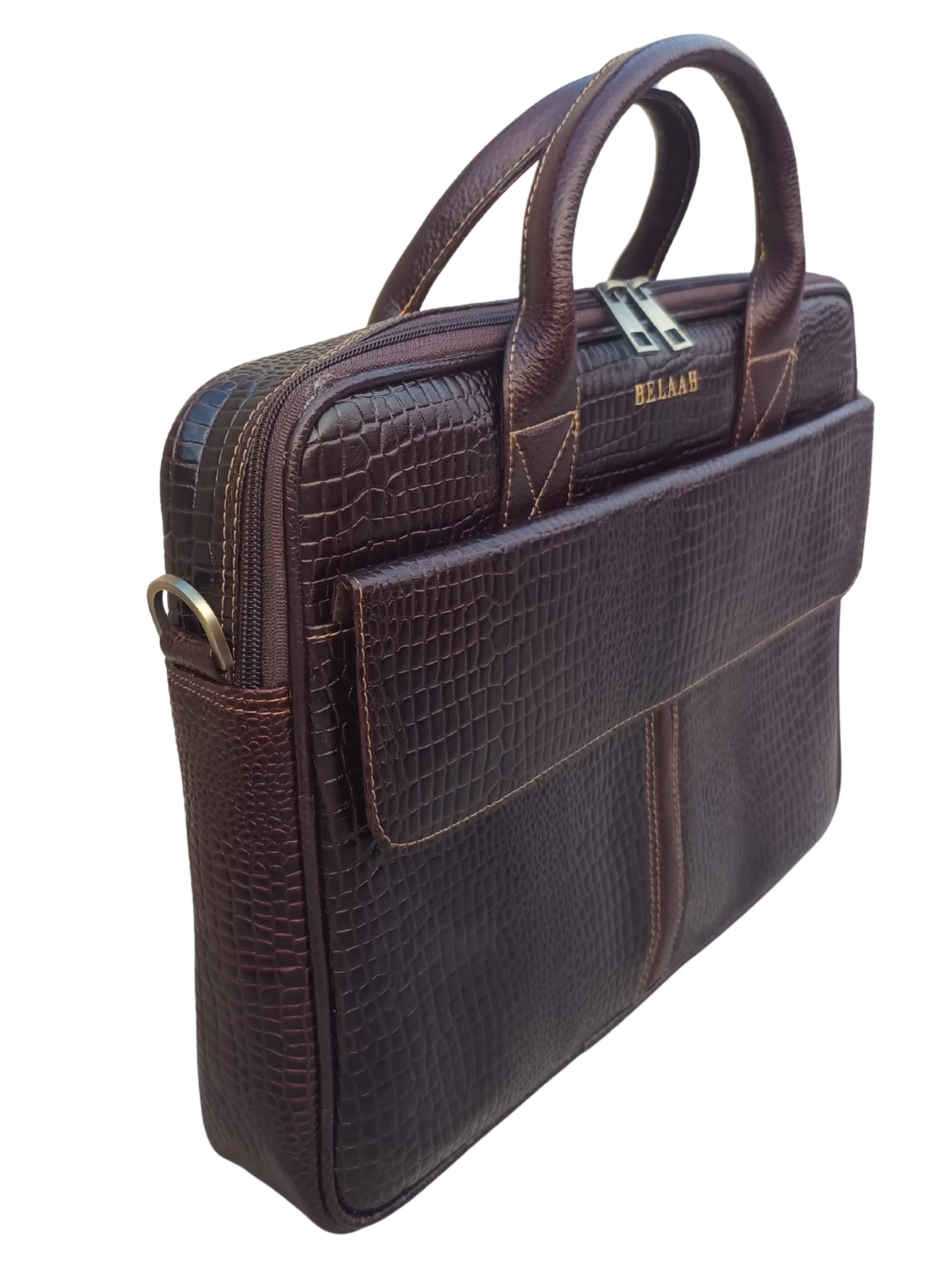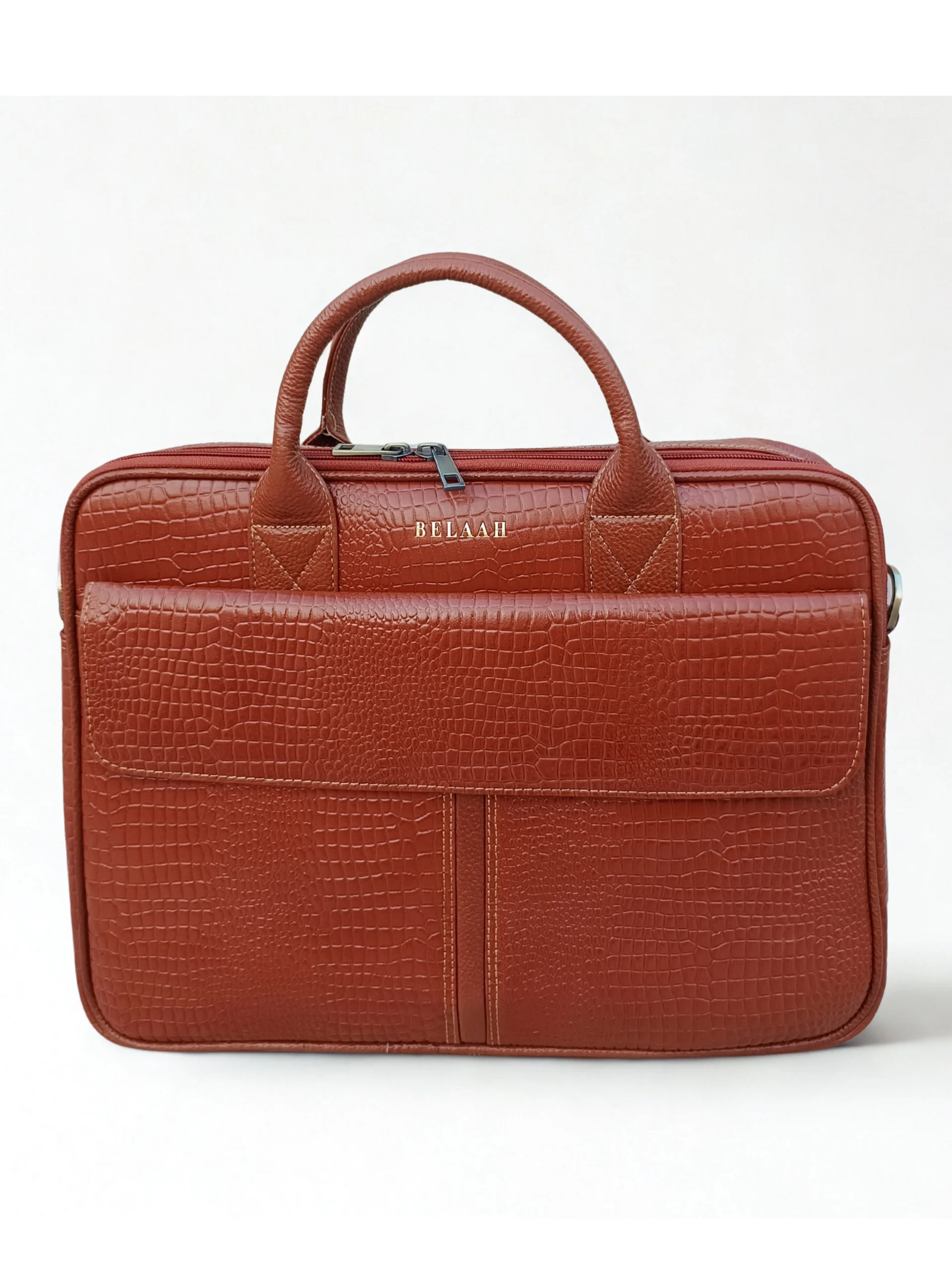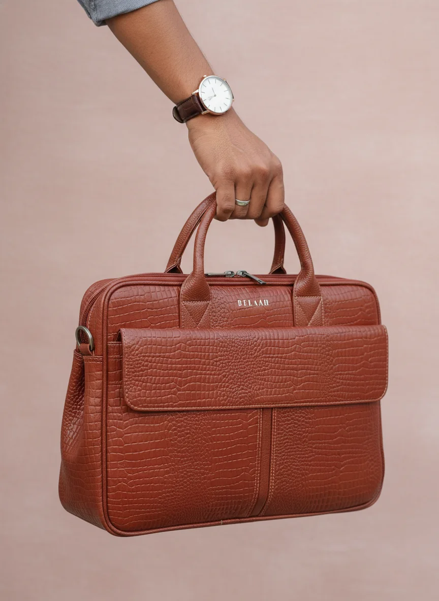 The Belaah Orion Medium Laptop Bag delivers executive style in a perfectly manageable size. Crafted from genuine leather with a bold crocodile-embossed finish, this bag is built for both aesthetics and durability. Its structured design ensures your professional essentials—from your laptop to documents—are protected and impeccably organized, making it your reliable partner for every business day.