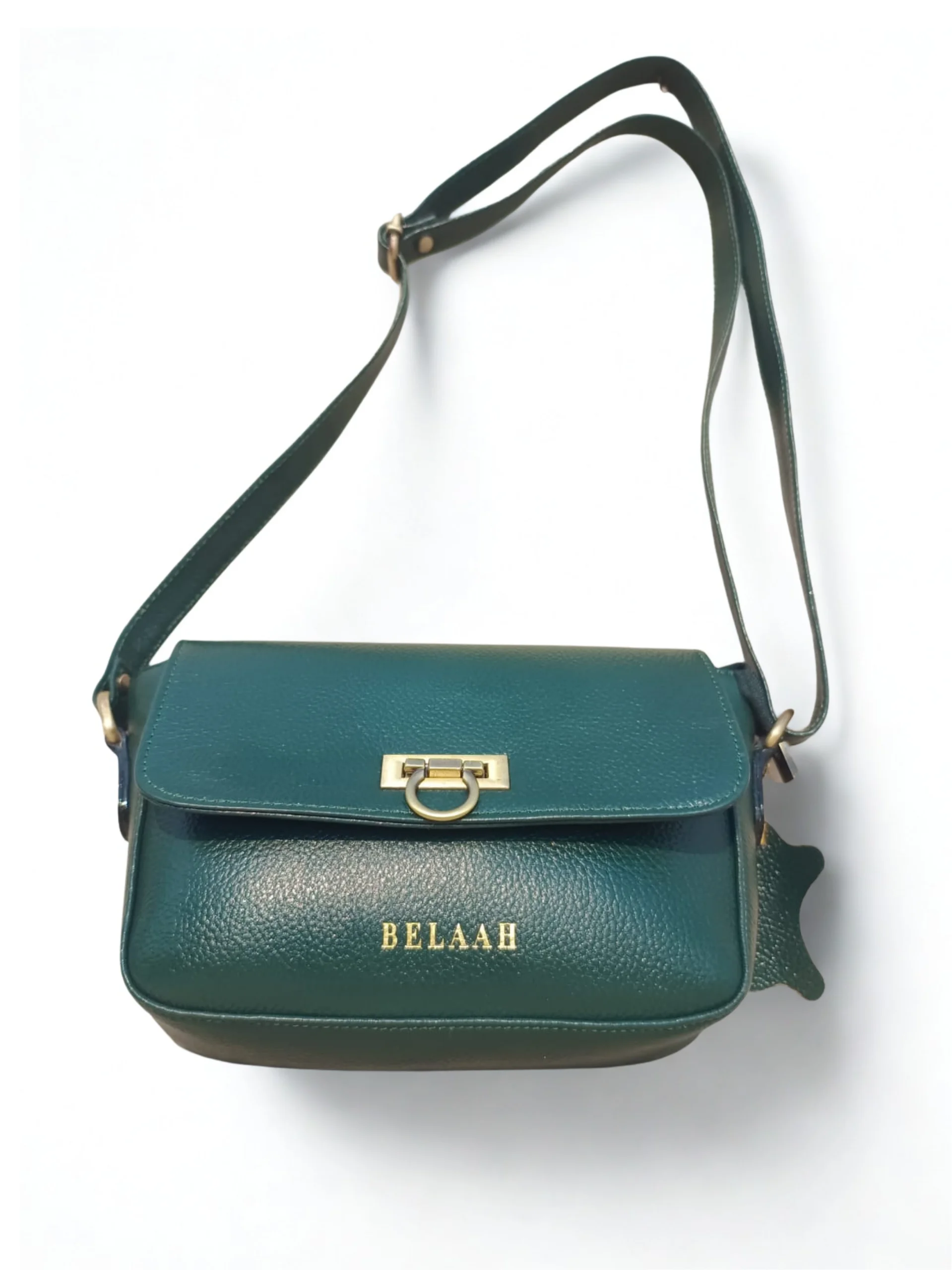 • Closure: Flap closure secured by a polished metallic twist-lock or ring clasp (as seen in image 2 & 3).